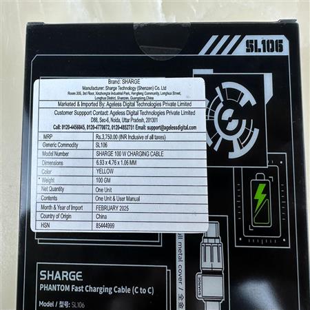 Sharge Phantom Fast Charging Cable USB C To C 240WModel: SL106Colour: YellowBill: Available/ Indian (GST Billing)Warranty: 6 MonthsCondition: Sealed NewContents: Bill, Box & CableDM For Deal Price if KeenLength: 1.2MOutput: PD 240W, Max 5AMaterial: Aluminum alloy + TPE + SiliconeMRP: 3,750/-Deal Price 3,000/-